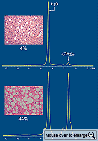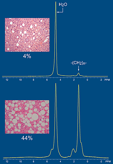 A depiction of the ability of proton magnetic resonance spectroscopy (1H-MRS) to quantitate hepatic triglycerides (TGs) non-invasively in humans. A spectrum from a subject with normal liver TGs is shown at the top with a corresponding liver biopsy showing a paucity of fat droplets. The lower spectrum is from an individual with non-alcoholic fatty liver disease (NAFLD) and demonstrates a liver TG content of 44%. The corresponding liver biopsy contains large amounts of lipid droplets. Normal liver TG content is < 5.6 %.