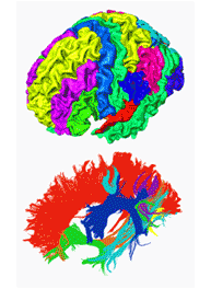 By integrating the information of cortical parcellation (upper image) from structural MRI and tractography from diffusion MRI (lower image), structural connectivity information can be obtained to study how the most complicated structure, the human brain, is “wired”.