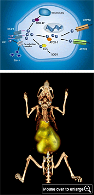 Copper metabolism is regulated by a finely-tuned network of copper transporters at cellular level. Systemically, positron emission tomography is particularly suitable for noninvasive assessment of copper metabolism in vivo using positron emitting copper isotope as a tracer. This PET image shows intensive copper-64 radioactivity in the liver of a mouse injected with radioactive copper-64 chloride intravenously, indicating usefulness of PET to analyze real-time copper metabolism in vivo.
