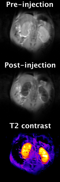 Magnetic resonance images of mouse kidneys at 9.4 Tesla showing the effects observed after injecting a 0.1 mmol/kg dose of a EuDOTA-based polymeric contrast agent. Uptake of the agent in the kidneys causes a 60% reduction in signal, making them appear dark (negative contrast). The negative contrast is caused by water molecule exchange between the Eu3+ ion and bulk water, which facilitates T2 exchange (T2exch). T2exch contrast is one on many novel methods used to further extend the functional and molecular imaging capabilities of MRI.