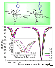Ratiometric PARACEST agents that are responsive to pH. Given that image contrast produced by PARACEST agents is extremely sensitive to chemical exchange rates (kex), sensors for detection of a variety of biological species have been developed. However, quantitative CEST pH sensing has only been achieved by using a cocktail of agents having weakly shifted –NH protons for ratiometric imaging, wherein one proton exchange pool is used as the CEST sensor for pH and another pool as a concentration marker. My second research is the development of PARACEST agent with an exchanging Eu3+-bound water resonance that shifts (50-55 ppm) with pH changes. This feature allows a direct measure of pH in a single experiment by ratiometric imaging.