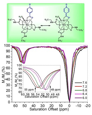 Deprotonation of the phenolic proton of Eu-pH sensor complex results in more negative charge placed on the carbonyl oxygen atom to coordinate with the Eu3+ ion (above) and a downfield shift in the exchanging Eu3+-bound water CEST peak from 50 to 55 ppm (below). [Eu3+] = 10 mM, B1 = 14.1 µT, and sat. time = 2 s.