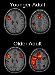 Two axial slices from a younger and an older individual illustrating increased bilateral recruitment with age. These data were collected as part of the Dallas Lifespan Brain Study led by Dr. Denise Park of the Center for Vital Longevity.
