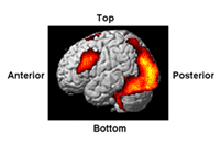 Functional MRI (fMRI): Lying inside the MRI scanner, the participant performs a cognitive task while brain images are continuously taken. By applying computational analysis on the images, brain regions that were utilized during the task can be identified. The figure illustrates the brain regions “activated” when the person looks at a scene displayed on a computer screen.