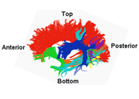 Diffusion tensor imaging (DTI): The MRI signal can be made sensitive to motion (diffusion) of water molecules. Because the pattern of water motion is dependent on the tissue orientation, this biophysical property can be utilized to identify anatomic organization of the brain. The figure on the left shows major white matter tracts that connect between various regions of the brain.