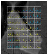 Magnetic resonance spectroscopic imaging (MRSI) offers a tool to assess biochemical content of the human brain. The figure shows MRSI data overlaid on an anatomic image from a patient with a high grade brain tumor. The spectra displayed in yellow are located in the tumor regions which exhibit abnormal spectral pattern with increased choline and decreased creatine and N-acetylaspartate.