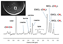 Spatially localized high resolution 1H NMR allows separate identification of intracellular and extracellular fats. Water soluble metabolites are also identified. The spectrum to the left was acquired from a ~ 1 x 1 x 1 cm voxel in the soleus muscle. Signals due to intraclellular (IMCL) and extracellular (EMCL) methyl signals from lipids are easily resolved. The intracellular concentration of taurine, carnitine and creatine may also be estimated.