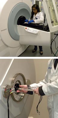 Molecular imaging is a branch of medical imaging science that aims to detect, localize and monitor critical molecular processes in cells, tissue, and living organisms using highly sensitive instrumentation and contrast mechanisms. There are several different modalities that can be used for noninvasive molecular imaging including magnetic resonance imaging (MRI), optical imaging, ultrasound, and the nuclear medicine methods, positron emission tomography (PET) and single photon emission computed tomography (SPECT). The primary areas of research activity in molecular imaging at the AIRC include MRI, PET and SPECT.