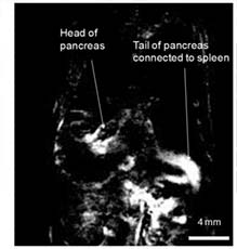 A gadolinium complex that senses release of Zn2+ from the pancreas is under development for imaging beta cell function. The MRI of a mouse shown here illustrates how the pancreas of a mouse “lights up” in response to injection of a bolus of glucose.