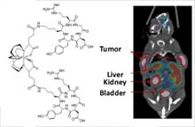 Detecting tumors in vivo with targeted imaging agents.The PET/CT image to the left shows a mouse after injection of 64CuDOTA-(cRGD)2 for detection of avb3 –integrin receptors in tumors. The monomeric form of agent containing only one cRGD peptide has a much lower affinity and does not highlight the tumor.