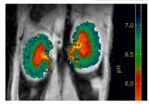 Acid generation is a fundamental property of normal metabolism and a hallmark of the hyper-metabolic state characteristic of tumors. Scientists at the AIRC are developing novel sensors for imaging tissue pH by MRI and are applying these in animal models of disease. The molecular image on the right shows the normal pH gradient in a well-functioning mouse kidney with a molecular sensor on board.